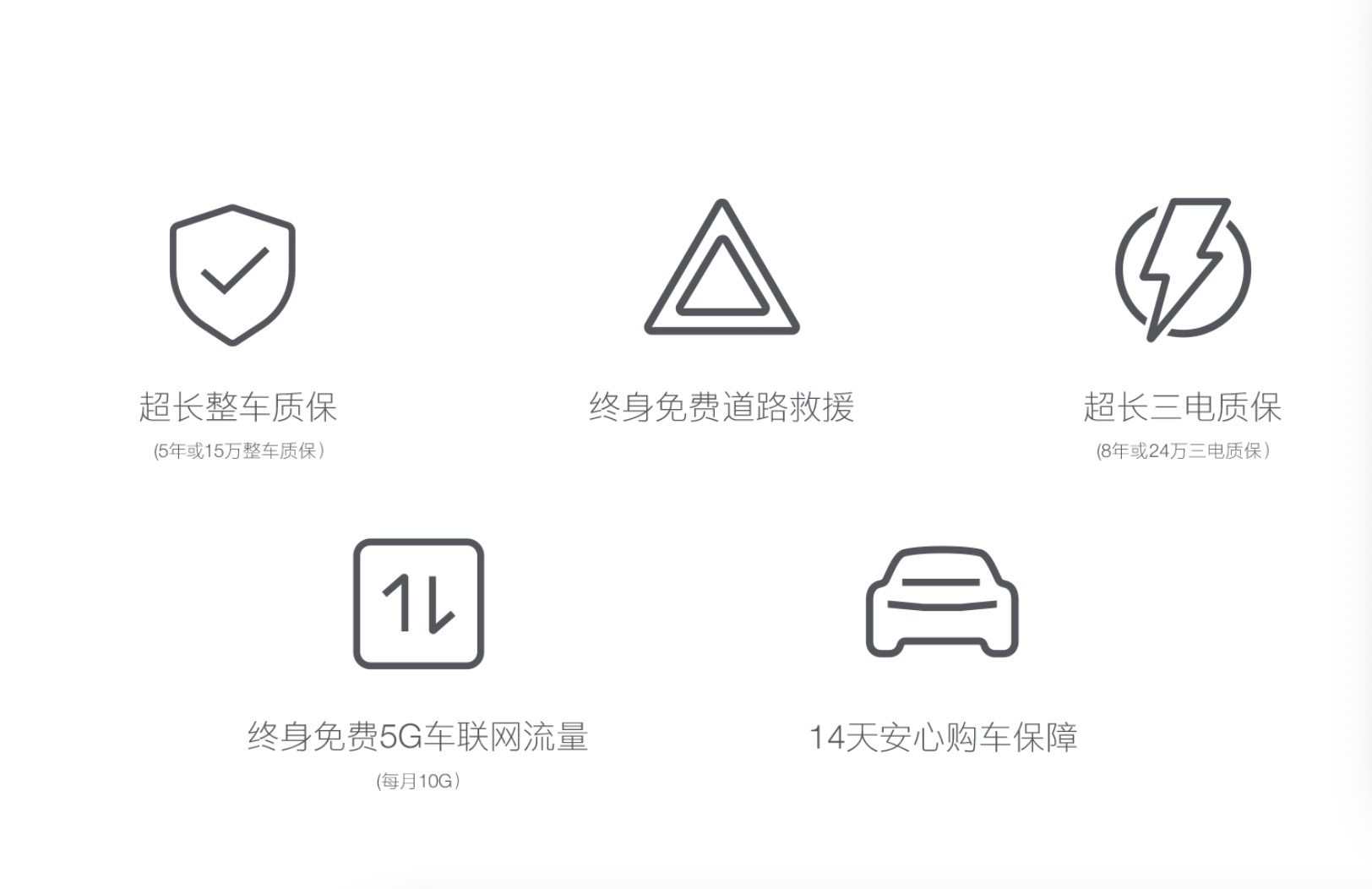 具体包含了终身免费整车质保、终身免费三电质保、免费保养、免费充电、5G免流量、免费道路救援,14天无理由退车承诺等服务。