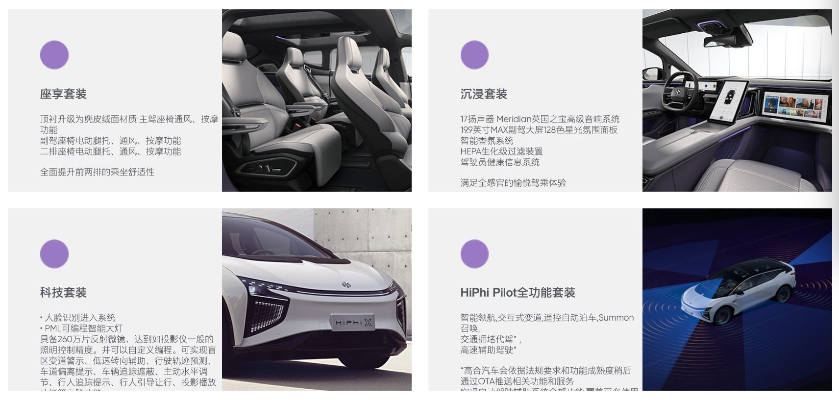 选装包上主要包括1.座享套装、2.沉浸套装、3.科技套装、4.HiPhi X全功能四个套装。