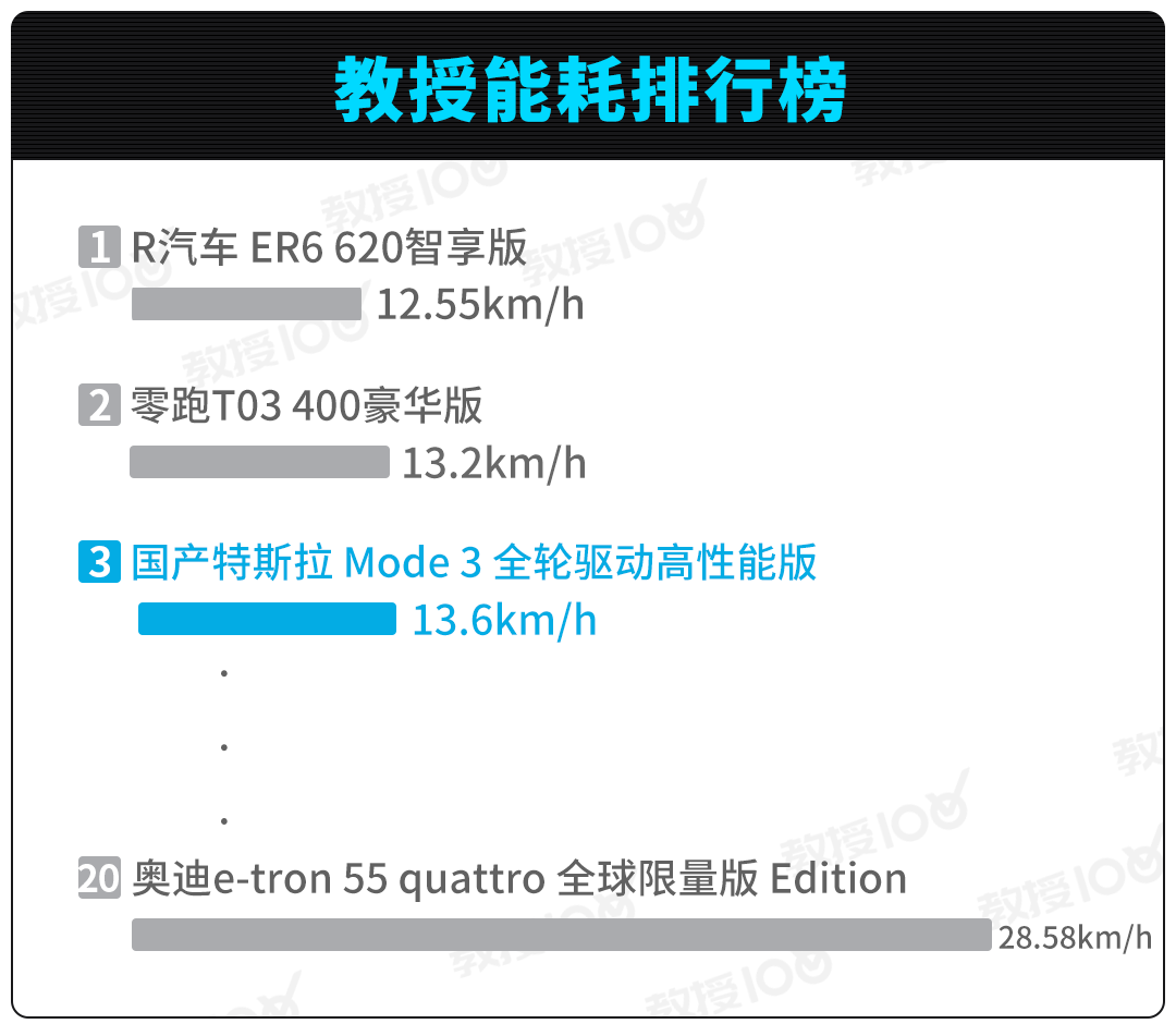 在【教授能耗排行榜】中,特斯拉Model 3高性能全轮驱动版的排名在第三位。