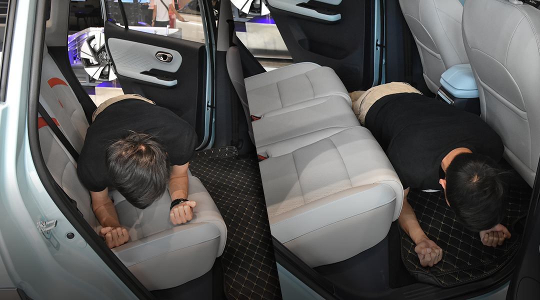 此外,前排座椅在拿掉头枕之后,可以全平放到与后排座椅无缝连接,形成了一个1.8米的双人大床房,基本解决你们想要的一切需求;同时后排座椅还能按比例放倒,形成一个更大的装载性空间,就算是不放倒,后备箱的容积也是够的,基本是常规车型的一个水平。