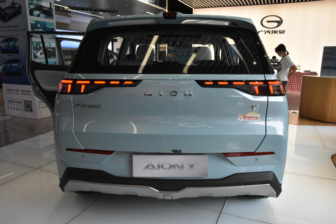 车身尾部造型比较简约饱满,最为亮眼的地方在于顶部镂空的尾翼以及点阵式尾灯,进一步提升整车的辨识度。总的来看,AION Y的外观给人的感觉还是比较时尚潮流的,好不好看买买君不敢下定结论,但确实很有新能源汽车的调性。