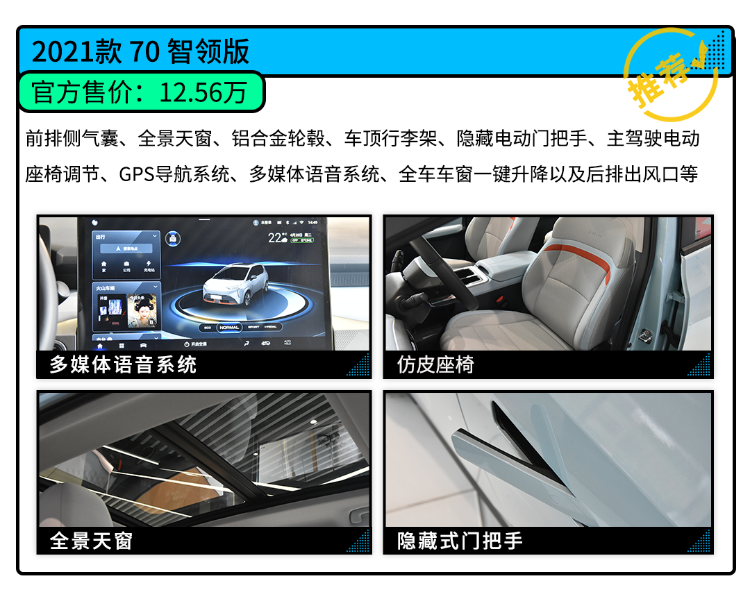 在配置选择方面,买买君更推荐续航里500km的车型,其中配智领版性价比更高,相比低配车型多了前排侧气囊、全景天窗、铝合金轮毂、车顶行李架、隐藏电动门把手、主驾驶电动座椅调节、GPS导航系统、更多功能的多媒体语音系统、全车车窗一键升降以及后排出风口等配置,售价仅多了1万元。