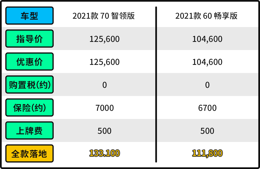 价格方面,目前新车刚上市不久,在终端市场并没有优惠,但补贴后10.46-14.86万元的售价还是有很强的诱惑力,以推荐的车型为例,裸车价为12.56万元,免购置税,交强险+商业险7000元,上牌费500元,全款落地价13.3万元左右。当然也可以贷款购车,以首付30%分期三年为例,首付金额为4.56万元,每月还款2625元。