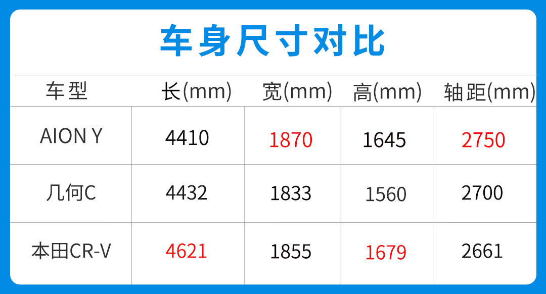 车身尺寸方面,广汽埃安AION Y虽定位为紧凑型SUV,长宽高分别为4410/1870/1645mm,但轴距达到了2750mm,要知道本田CR-V的轴距才2661mm,而被誉为中型SUV标杆的汉兰达,轴距也不过2790mm,可见新能源汽车在空间利用率方面是远大于传统燃油车。