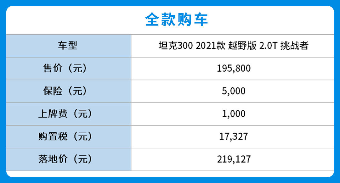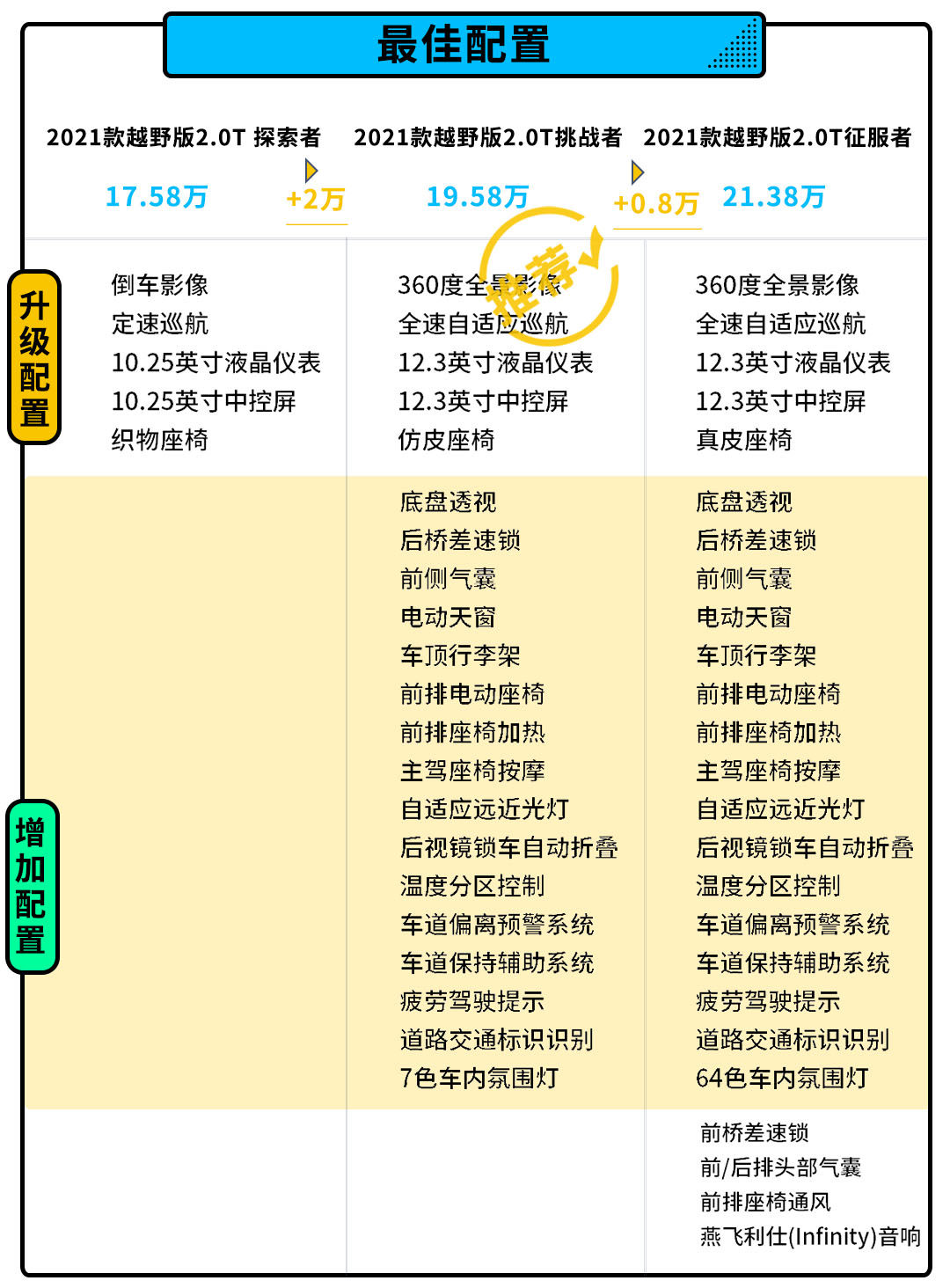 以售价19.58万元的“2021款 越野版 2.0T 挑战者”为例,全款落地在21.8万元左右。