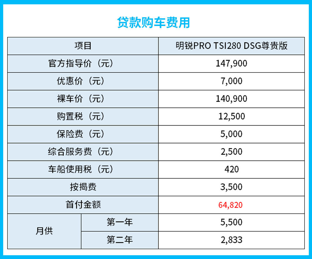 如果贷款购车,需支付3500元按揭费,不过目前可享受10万元的免息政策。但需要注意,免息贷款只能分24期还,而且第一年需还款60%,剩下的40%第二年还。这样的话,第一年的月供压力会比较大,为5500元/月,第二年为2833.33元/月。