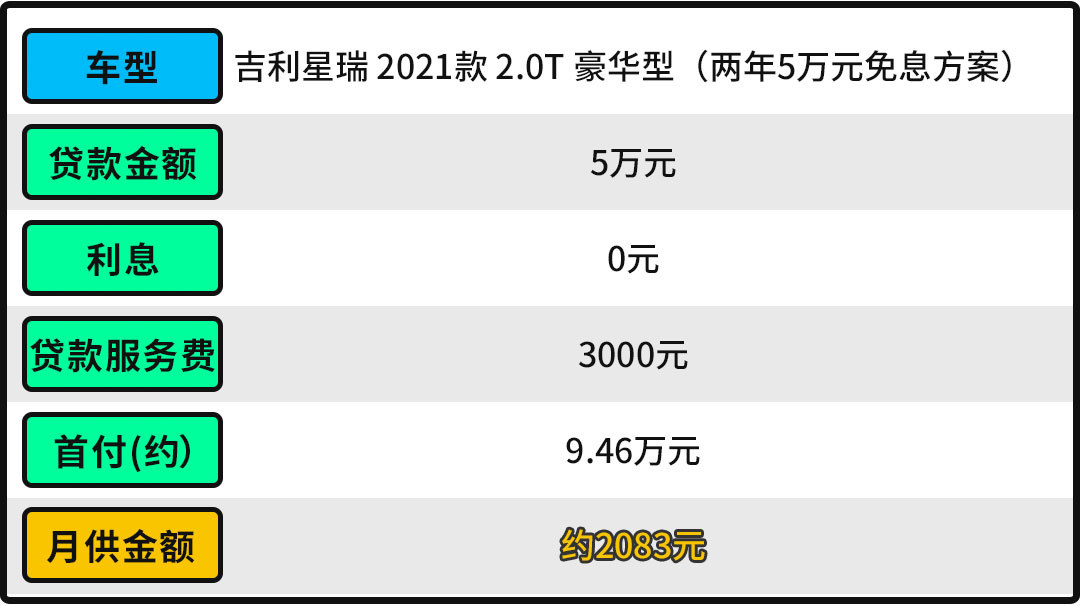 在追问下,随后销售才给出一套银行的两年5万额度的免息贷款方案,加上3000元的贷款服务费后,首付约9.46万元,而月供则为2083元,相信对于大部分年轻人来说压力都不算大,但如此多重套路下来,不熟悉行情的消费者估计会被宰上一大笔钱。