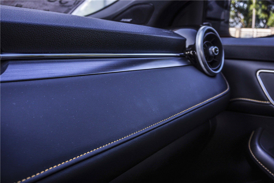 将视线转至中控台右侧,用手触摸竟然是大面积的皮革包裹,更有细腻的缝线,这在十万级的合资车型上几乎是不可能看见的。