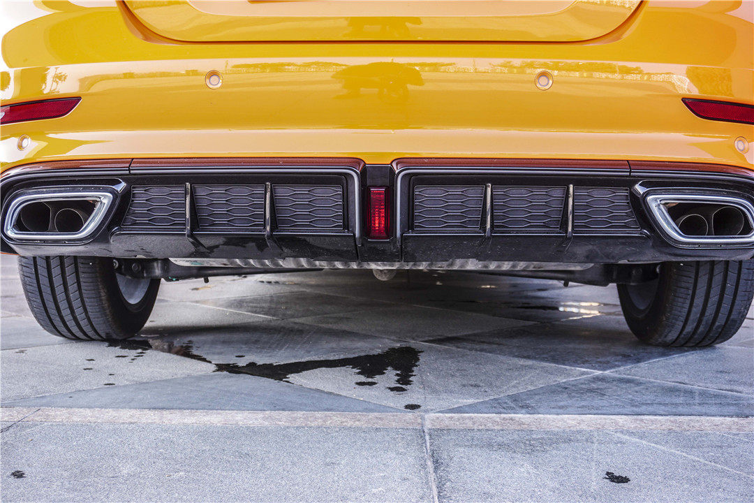 至于双边共两出排气(凑近看其实是双边共四出,只是远看像双边共两出,反向操作让人捉摸不透)、凹凸有致的尾部造型、张扬的尾部扩散器、飞翼式导风口,与赛车尾翼配合也是恰到好处。