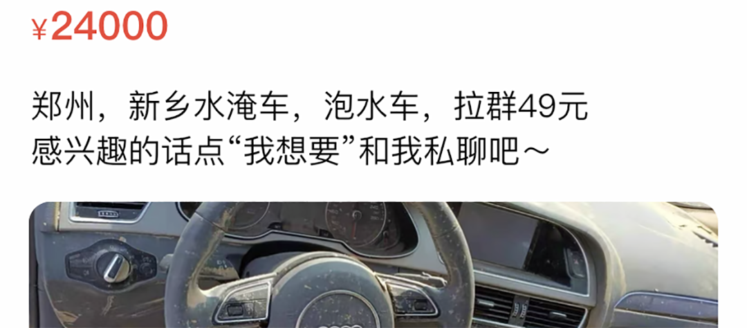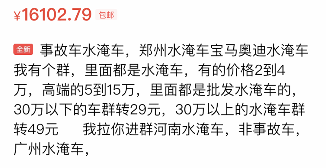 一边是郑州车主的集体哀嚎,但一边则是“捡漏王”们的狂欢。就在某鱼这一更多面向普通消费者的平台上,就出现了N多泡水车出售,这里面甚至隐藏了商机、甚至是骗局…你想捡漏买泡水车?还得小心被骗!