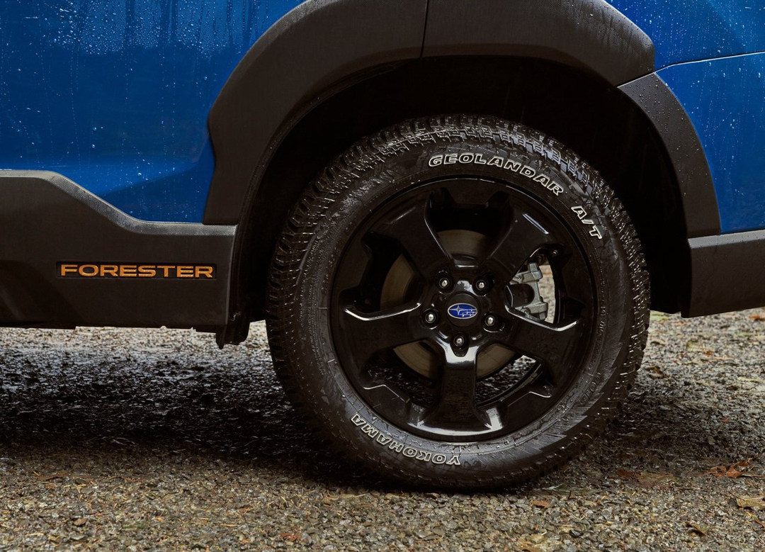 作为一款主打越野场景的车型,森林人Wilderness自然是配备了全地形轮胎,并更换为17英寸的五幅式轮毂,将有着更强的抓地力以及适应性。而且车身周围还加入了多处的黄色英文标识,彰显其独特的车型身份。