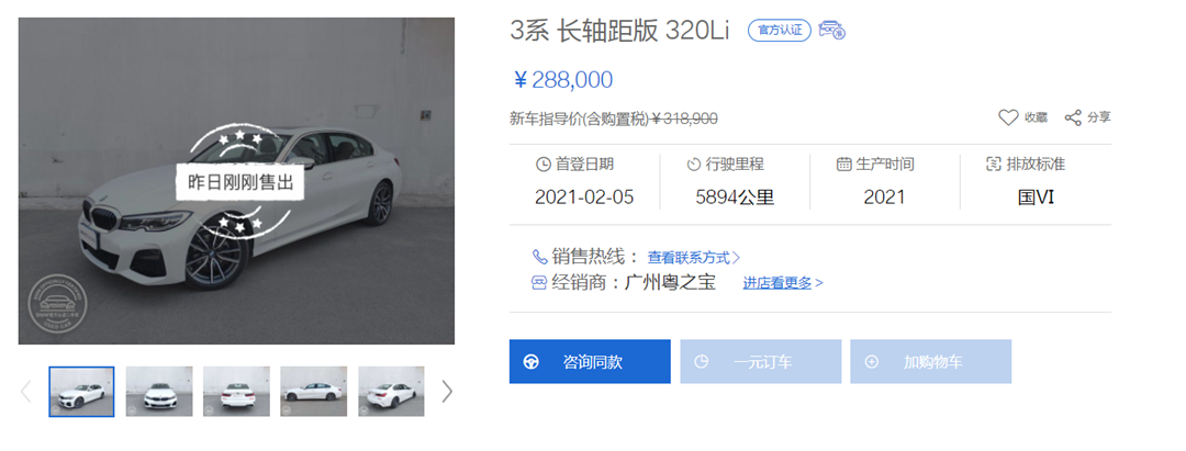 二手车的需求在增大,二手车的价格自然就是水涨船高。就比如宝马的二手车官方网站上,一辆3系标准轴距 325i二手车,已经行驶超过1万公里,开了也超过1年,但仍能卖出32万的高价。