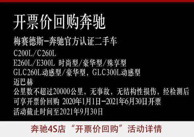 其次就是奔驰,发票价回购包括C级、E级、GLC、迈巴赫,要求开票时间是2020年1月1日-2021年6月30日之间,公里数不超过2万公里,并且无事故、无结构性损伤。