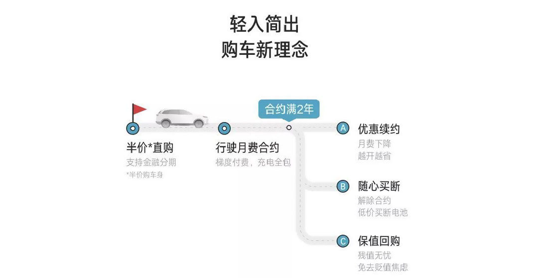 并且在用车的两年时间里,车主还需按月支付套餐使用费,才享受到可获得电池使用权、到店免费充电服务和流量免费使用三大服务。