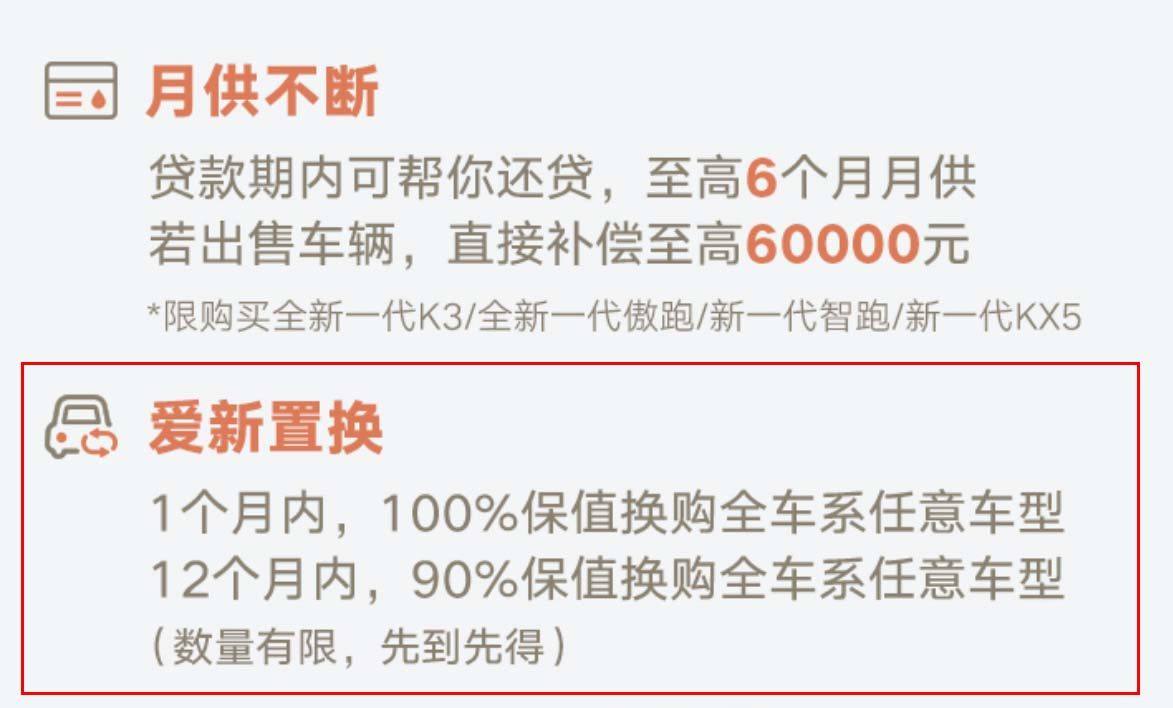 相比上述的车企,起亚的保值回购政策可以说是最彻底的,官方承诺1个月内能以100%保值换购全系任意车型,真正实现一个月换一辆车的梦想。如果车主想开久点,起亚还提供一年90%保值换购政策。