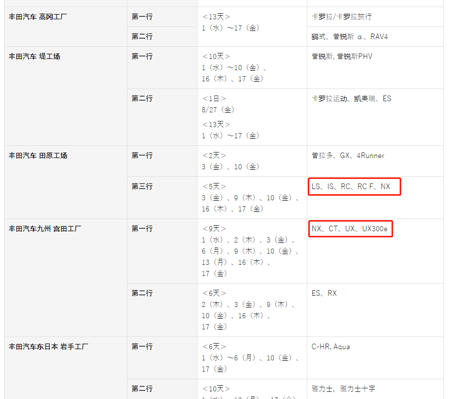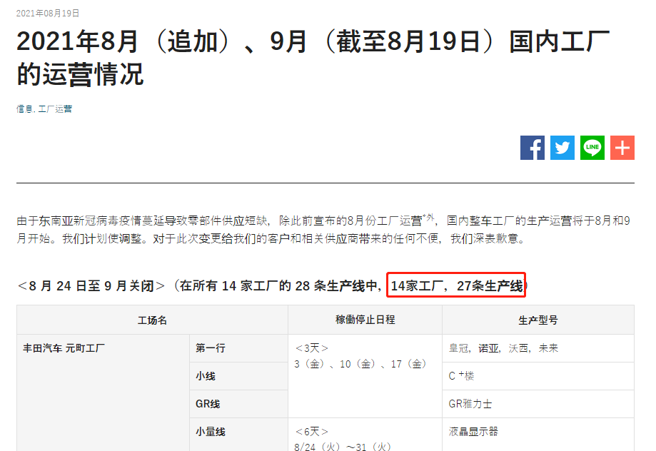就连丰田这样的车企巨头也面临着同样的问题,早在8月份的时候,丰田日本官网就发布过一则消息称目前在日本地区包括元町工厂、高冈工厂、堤工场、田原工场、宫田工厂等在内的工厂共14家,28条生产线实行间歇性停运,涉及的车型包括GR雅力士、普锐斯、NX、ES、LS等热门车型。