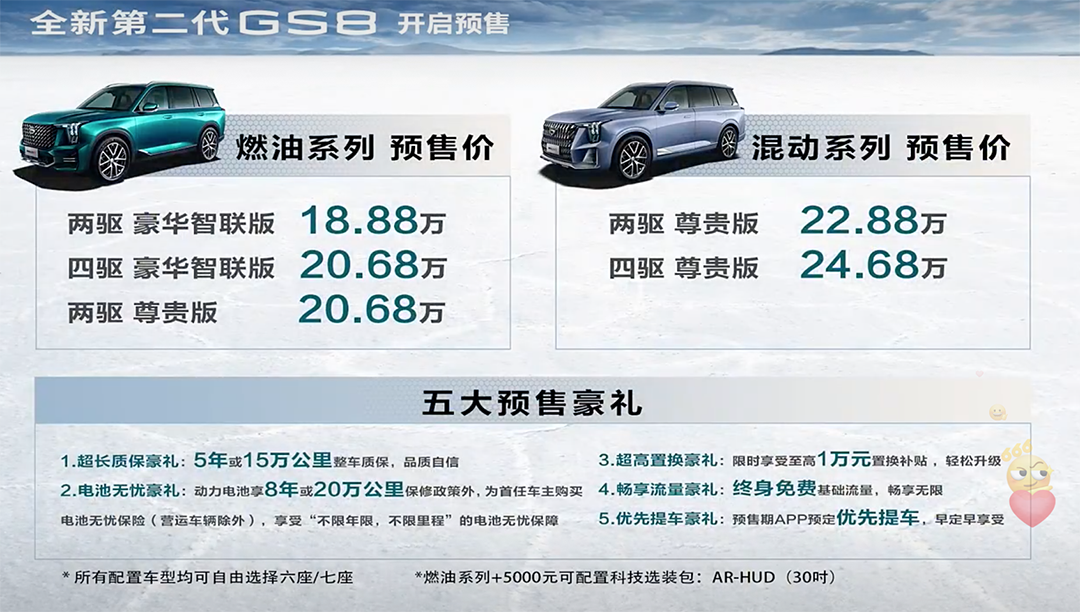 第二代GS8将于11月正式上市,目前预售价为18.88-24.68万元,这次到店实拍的版本是预售价20.68万的两驱尊贵版,不废话,直接上总结: