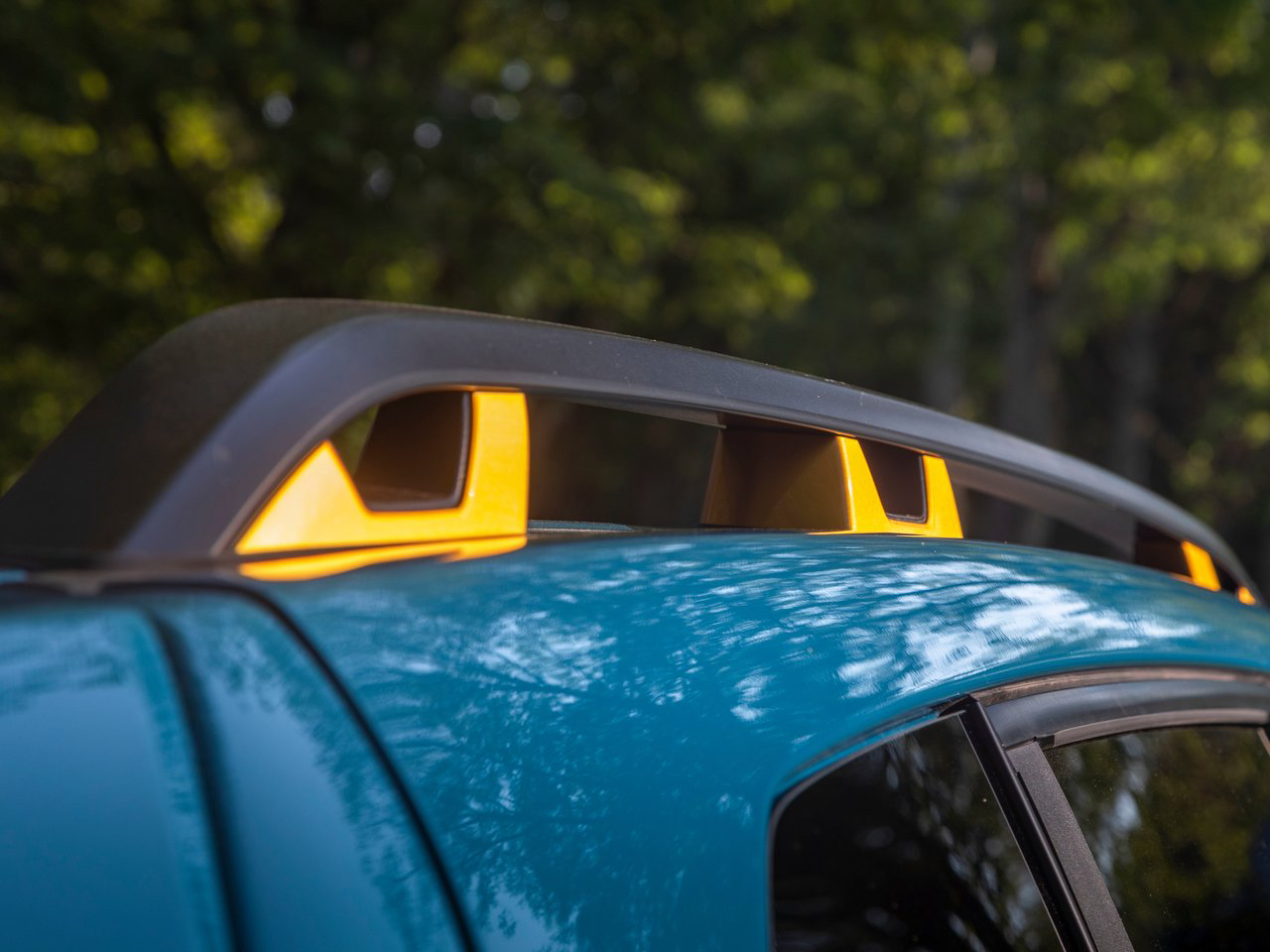 Geyser Blue的车漆涂装俨然十分符合一台户外越野SUV的设计风格,17英寸的熏黑轮毂搭配全黑侧裙包裹让整体侧面看起来层次感分明。另外,车顶的专属行李架能够承载200-800磅的储物重量,可自行加装户外帐篷以此满足自驾野外露营的需求。