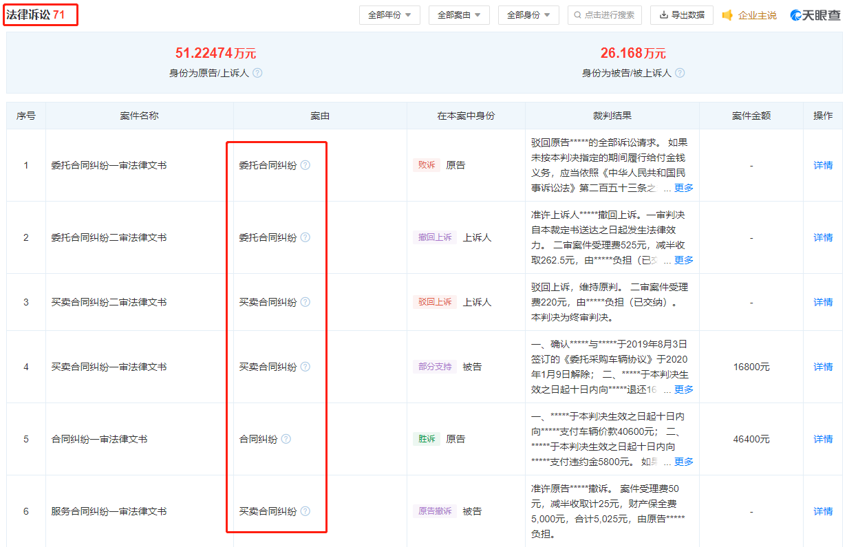 当然或许也有网友持有不同意见,认为卖家冤。确实,在没有看到聊天纪录之前,感觉卖家就是被网友捡到漏了。但事后在天眼查稍微了解了一下该公司的状况,在此前已经存在有多起关于车辆买卖的合同纠纷。Emm...只能说可怜之人必有可恨之处吧,这家公司已经是见惯大场面了(惯犯)。