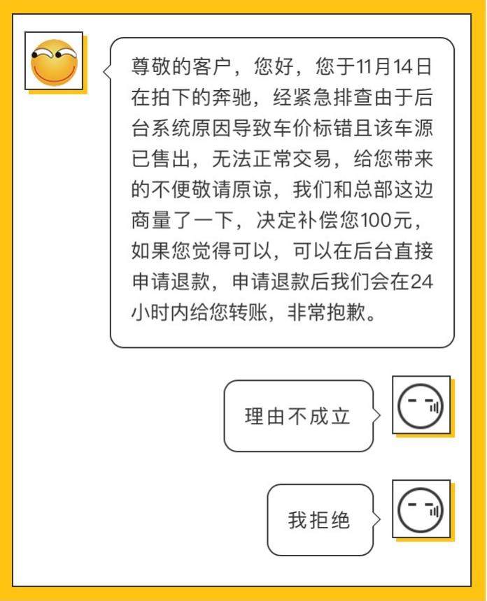 果不其然,在买家多次拒绝退货之后,卖家承认该商品的标价是后台系统的原因导致车价标错,经商讨之后总部决定赔付100元给买家作为赔偿。