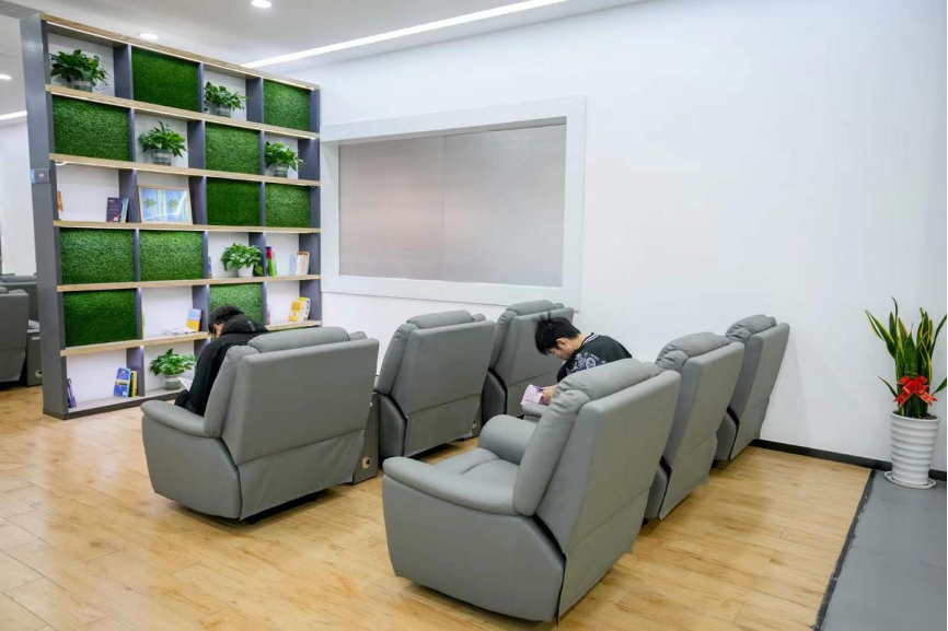 客户休息区备有多种小吃、饮料,还配备了阅读区、观影区、桌上足球,又甚至是竞速模拟游戏机等休闲娱乐区域,保养过程不无聊乏味,并且可以通过手机端,实时查看爱车的维修进度以及状态。