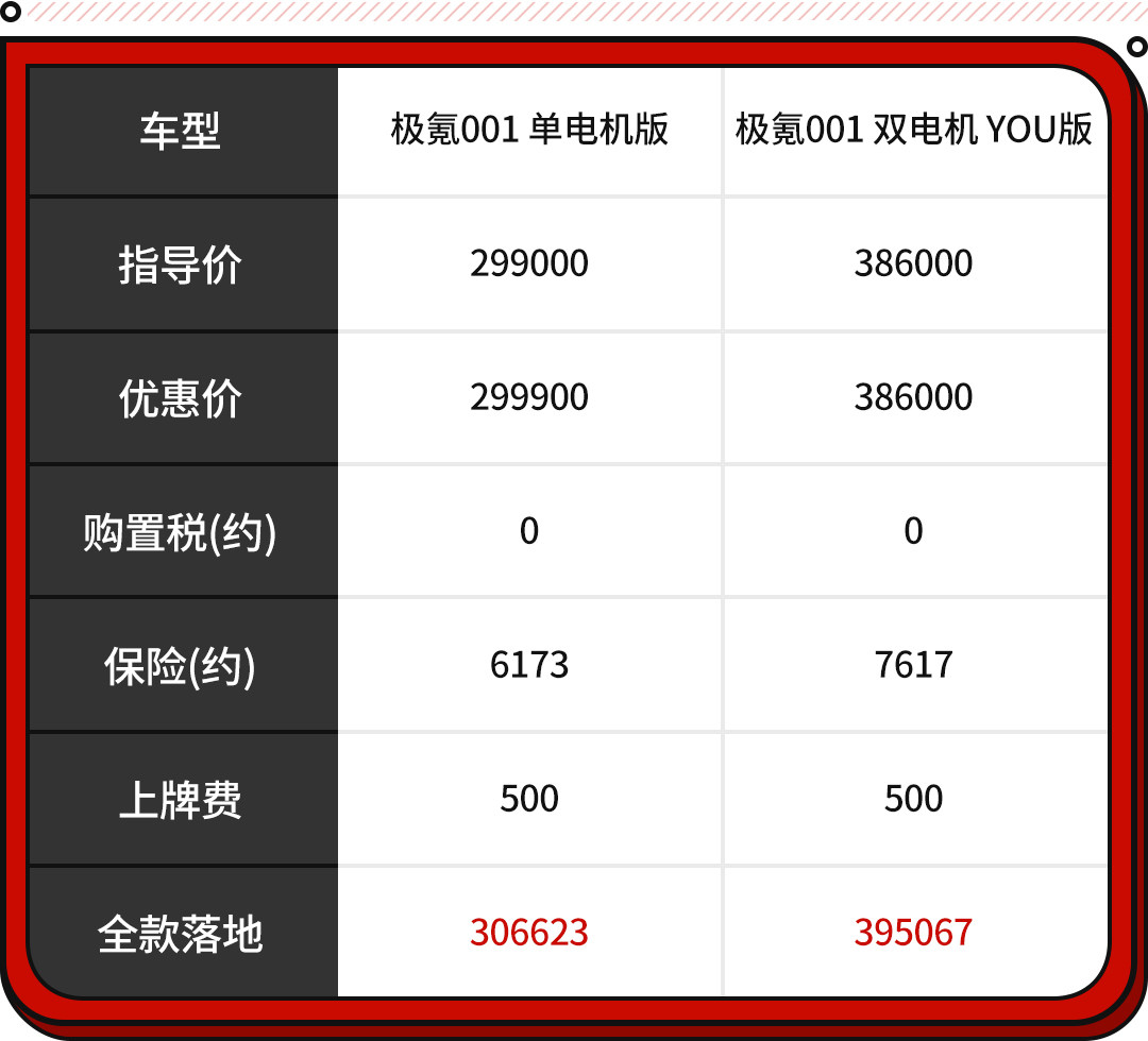 在落地价格方面,极氪001在很多地区基本没有什么优惠幅度。以推荐的超长续航单电机车型为例,裸车价格应该在29.9万左右,免除购置税后也还有交强险、商业保险等的必要花费,全款落地价在30.6万左右。如果是分期贷款购车,以三成首付36期来算,首付要付8.9万元,月供需要6249元。以上价格仅供参考,实际价格以当地优惠为准。
