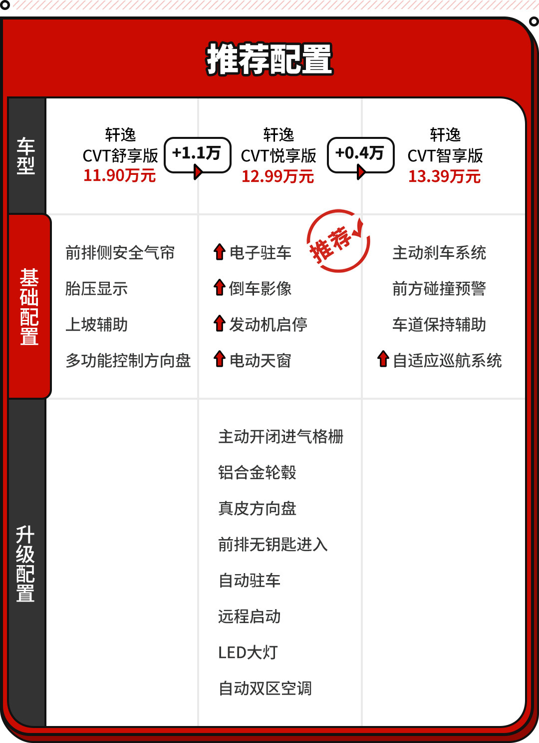 而售价12.99万元的轩逸CVT悦享版则在上一款车型上提升了不少配置。电子驻车、倒车影像、发动机启停、电动天窗、前排无钥匙进入、自动驻车、远程启动、内置行车记录仪、OTA升级、语音识别、LED大灯、自动双区空调和后排出风口等近26项配置,但在售价上只比舒享版车型贵出1.1万元,可谓是良心之举。
