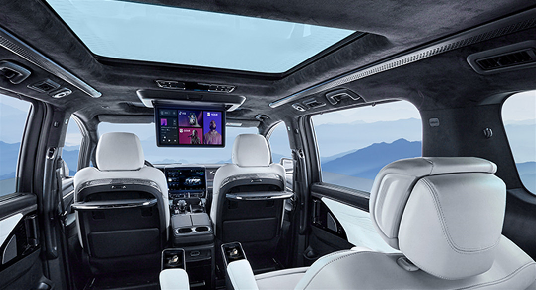 前排座椅靠背还提供了小桌板,带24节气国风系列的中药香氛三区自动空调,以及15.6英寸、1080P的吸顶电视,可以进行手机投屏。