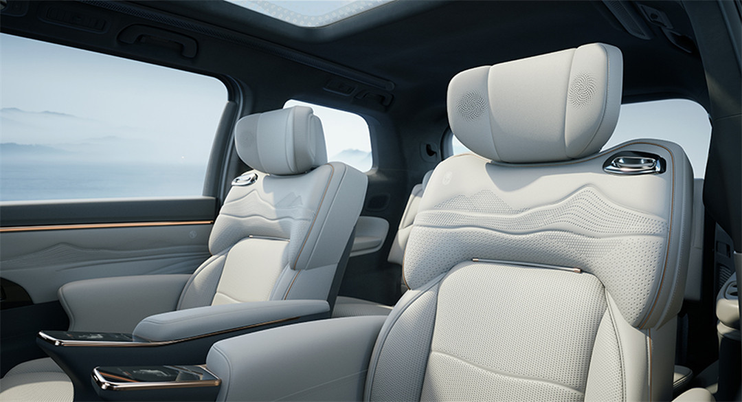 中排两张座椅的扶手屏幕集成了所有功能,支持全电动调节、加热、通风、记忆、10点+3种模式按摩、75°调节腿托、16扬声器雅马哈音响等。