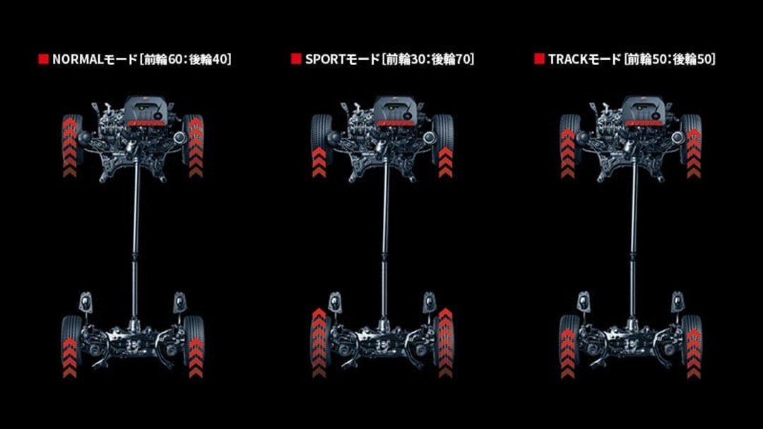 四驱配合驾驶模式提供了正常、运动、赛道,通过自家的JTEKT电控多片离合器,可以让前后轮的扭矩输出分别对应在60:40、30:70、50:50之间。赛道版和Morizo前后桥的托森式差速器还带有LSD功能。