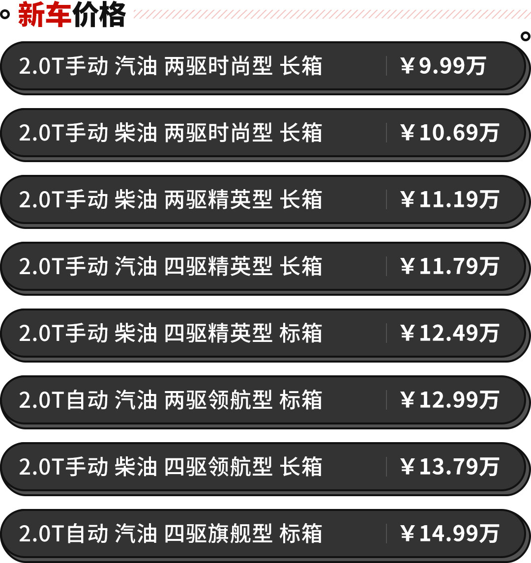 汽油和柴油版除了入门车型是后驱外,其他都标配四驱,长货箱车型反而比标箱贵,但价格最高的是长箱平箱车型。