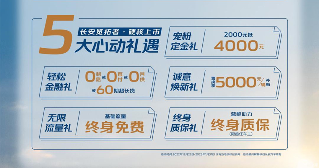 新车可享2000元订金抵4000元定金礼,0首付或0月供或0利息金融礼,置换5000元焕新礼,基础流量终身免费流量礼,蓝鲸动力终身质保质礼。