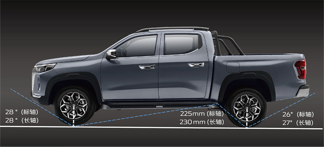 标轴版的长宽高分别为5350/1930(1945)/1875mm,货箱尺寸1600/1595/500mm,接近角28度、离去角26度、离地间隙225mm。