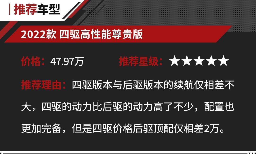 锐歌是一款没有明显短板的豪华纯电SUV,无论是外观、内饰、舒适性、豪华性还是动力配置。在40-50万这个价位上来说,具有极高的性价比。在购车的选择上,最为推荐的配置就是2022款四驱高性能尊贵版,它与普通的后驱版本续航只降低了48km的续航,总体续航上差不多。在动力上,四驱的前后双电机比后驱的单电机高了163马力,动力大幅提升,而且四驱的驾驶会比后驱更加的平顺,能应付更多的复杂场景。不仅如此,四驱的高性能版本在价格上与后驱尊贵版的仅相差2万,与后驱的豪华版仅相差4万。相差的价格不多,四驱高性能尊贵版可以换来更完善的配置,更强的动力,无疑是最好的选择。