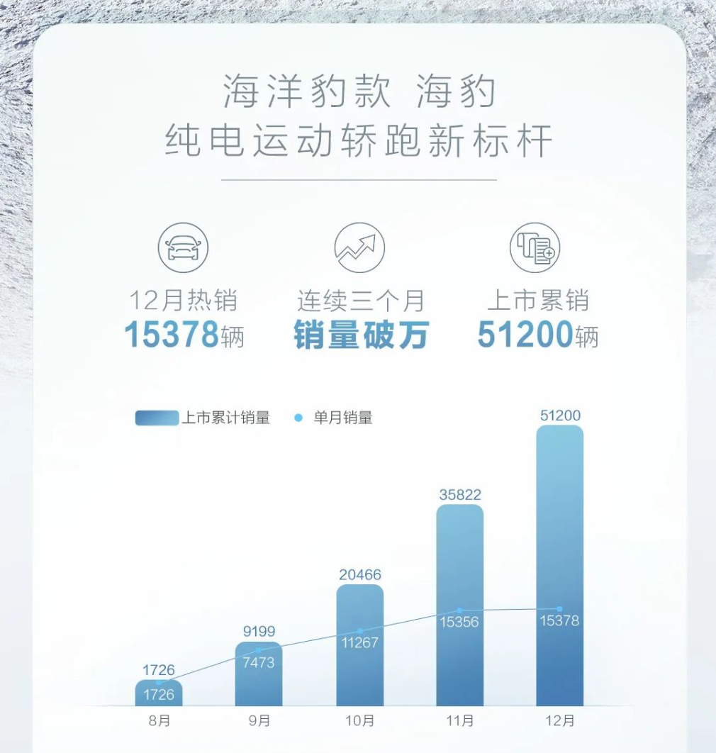 比亚迪海豹可谓是出道即巅峰,它在去年12月份的销量高达15378辆,2022年累计销量高达51200辆。要知道,海豹截至去年12月份才刚刚开启交付5个月。