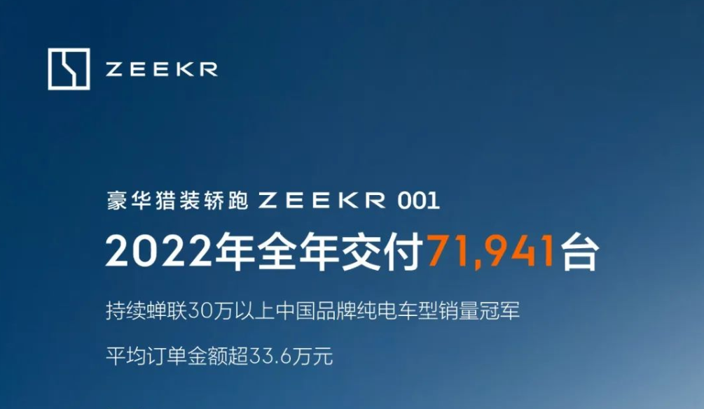 2022年,极氪001凭借着71941辆的销量成绩,拿下了去年30万以上中国品牌纯电车型的销量冠军。即便放眼30万元以上的整个纯电动汽车领域,极氪001在去年的销量成绩也仅次于特斯拉Model Y。