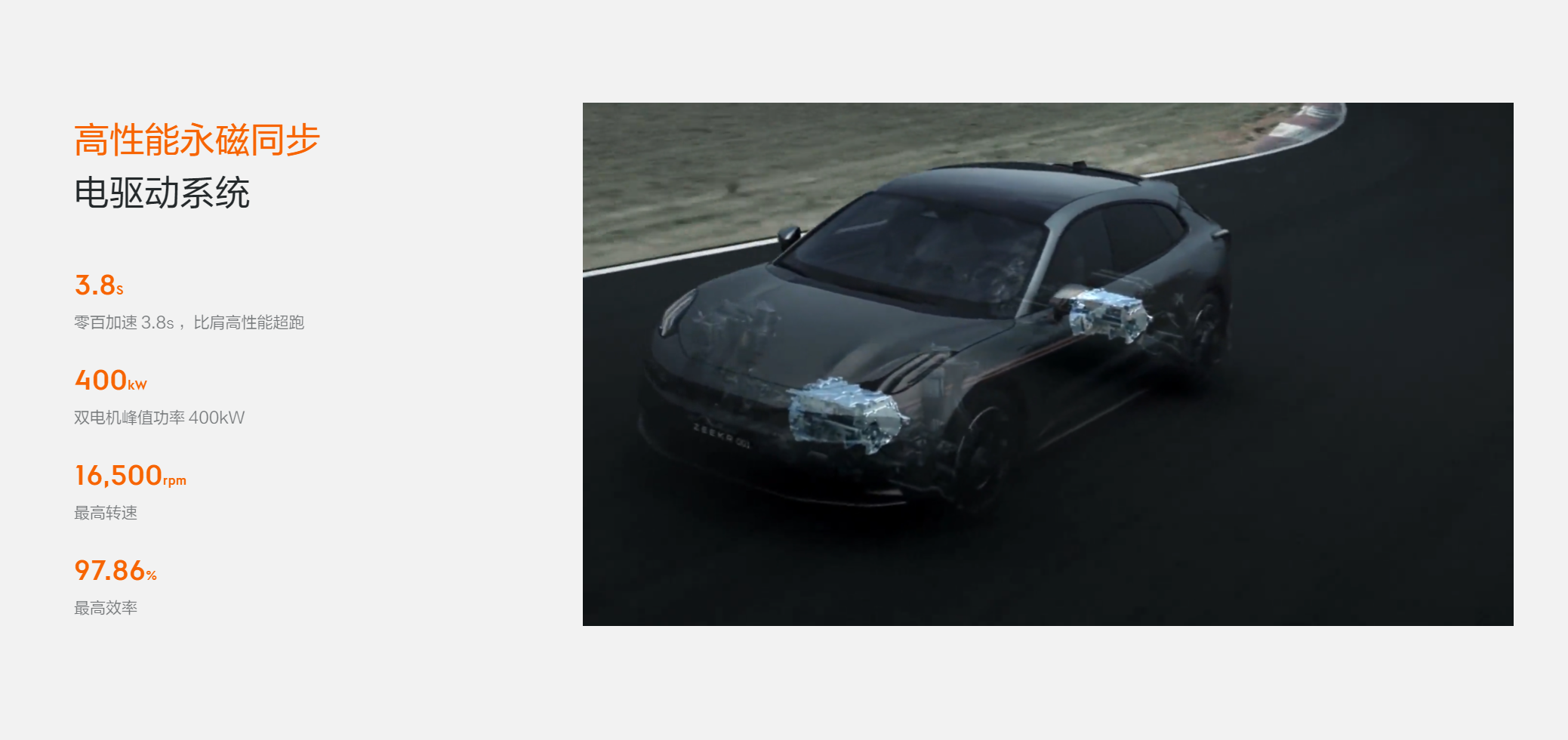 论性能,极氪001这三款车型在前后双电机四驱的加持下都拥有高达400kW的电机总功率(544匹马力),以及686N·m的电机总扭矩,0-100km加速时间只需要3.8秒。