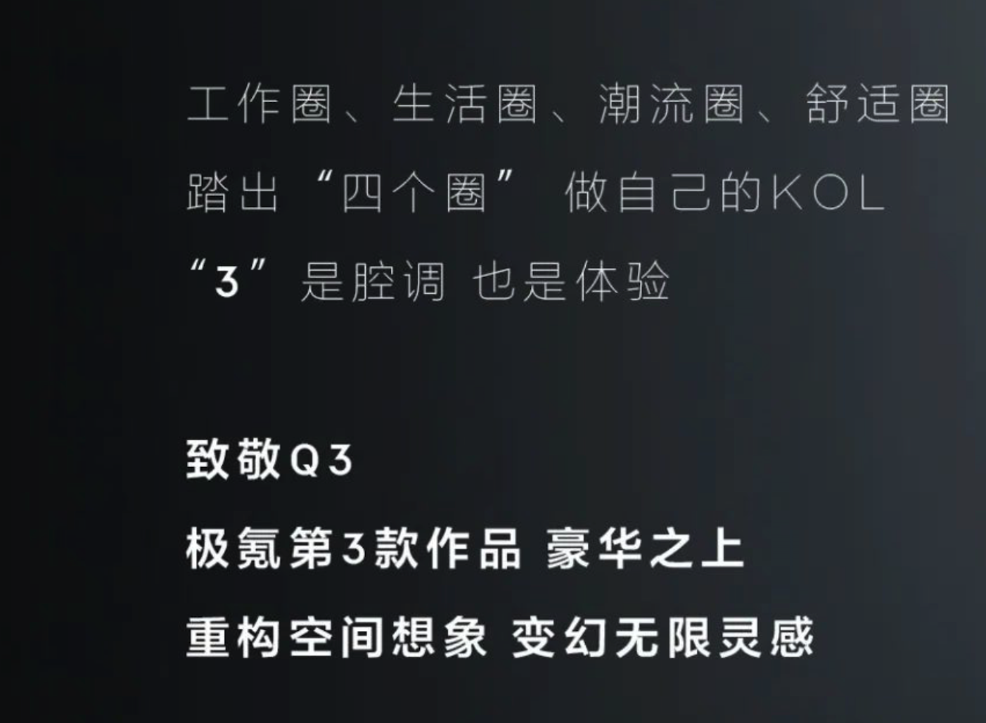 在性能方面,不难让人想到了Model 3和宝马3系,至于空间方面,极氪则提到了同为紧凑型产品的奥迪Q3。