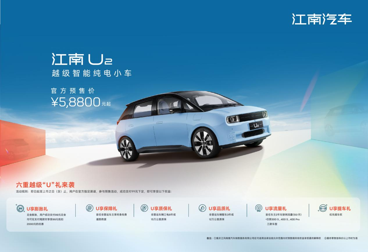 为了回馈广大消费者的热情支持,江南汽车为此次预定活动提供了丰厚的定车权益。即日起至上市之日(含)止,消费者通过官方指定线上、线下渠道(江南汽车官网、江南汽车APP、全国授权经销商)参与U2预售活动,成功支付99元下定,即可享受限时放送的六重越级“U”礼!具体权益如下: