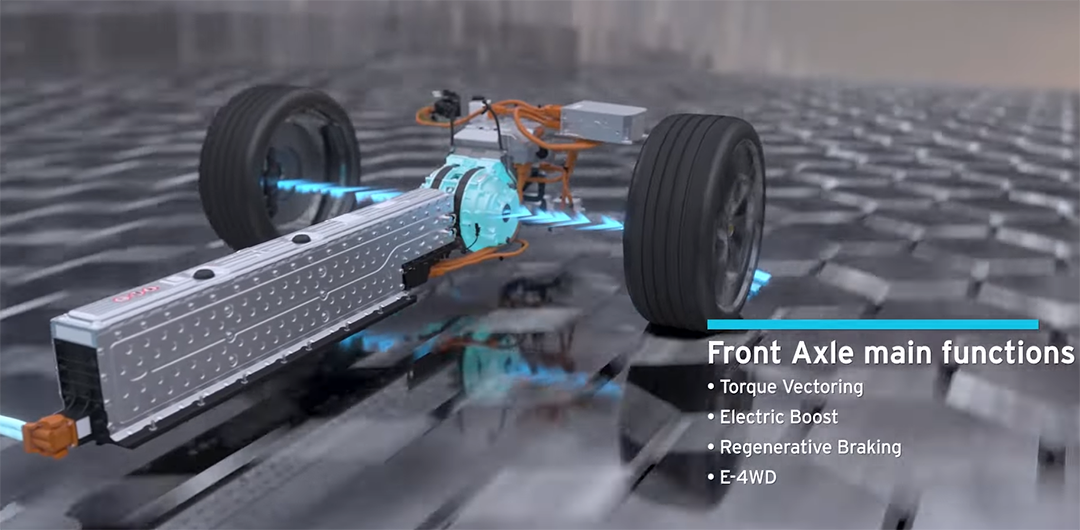 真正能够带来驱动力增强效果的电机还是在前轴的两台驱动电机,它们能够带来综合输出功率为180匹马力的辅助动力,并且同时也是前轮唯一的动力来源。