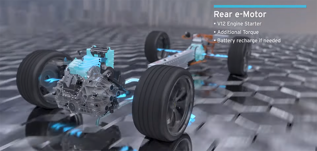 据介绍这台后轴电机虽然拥有最大150匹马力的输出功率,但它的主要作用是启动V12发动机、优化变速箱性能以及在需要时发电为3.8kWh电池组补能,而只有在全力加速等少数工况下才会提供额外的扭矩辅助。