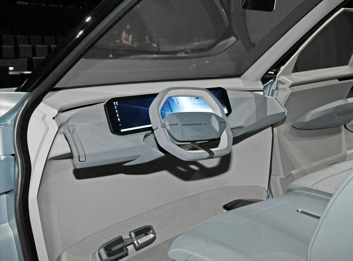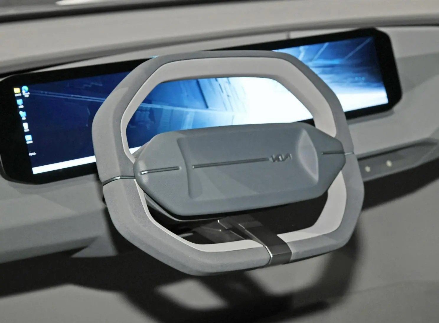 同时,在起亚EV5概念车上,我们也能看见十分朴素但不简陋的布局,常见的挡杆、空调出风口、雨刷器拨杆以及众多物理按键全部转变为隐藏式设计,集成在中控屏幕上。你能看见的只有双平底造型方向盘和一体式屏幕。