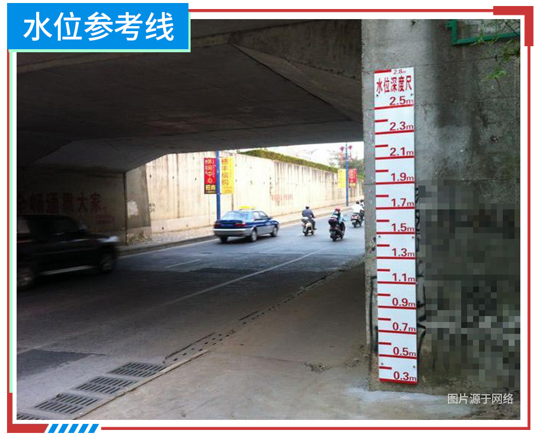 面对涉水路段,一定要先确认水深,一般低洼易积水路段通常会设有水深参考线,也可以观察周边车辆的通行情况来判断水深,切勿盲目贸然涉水。