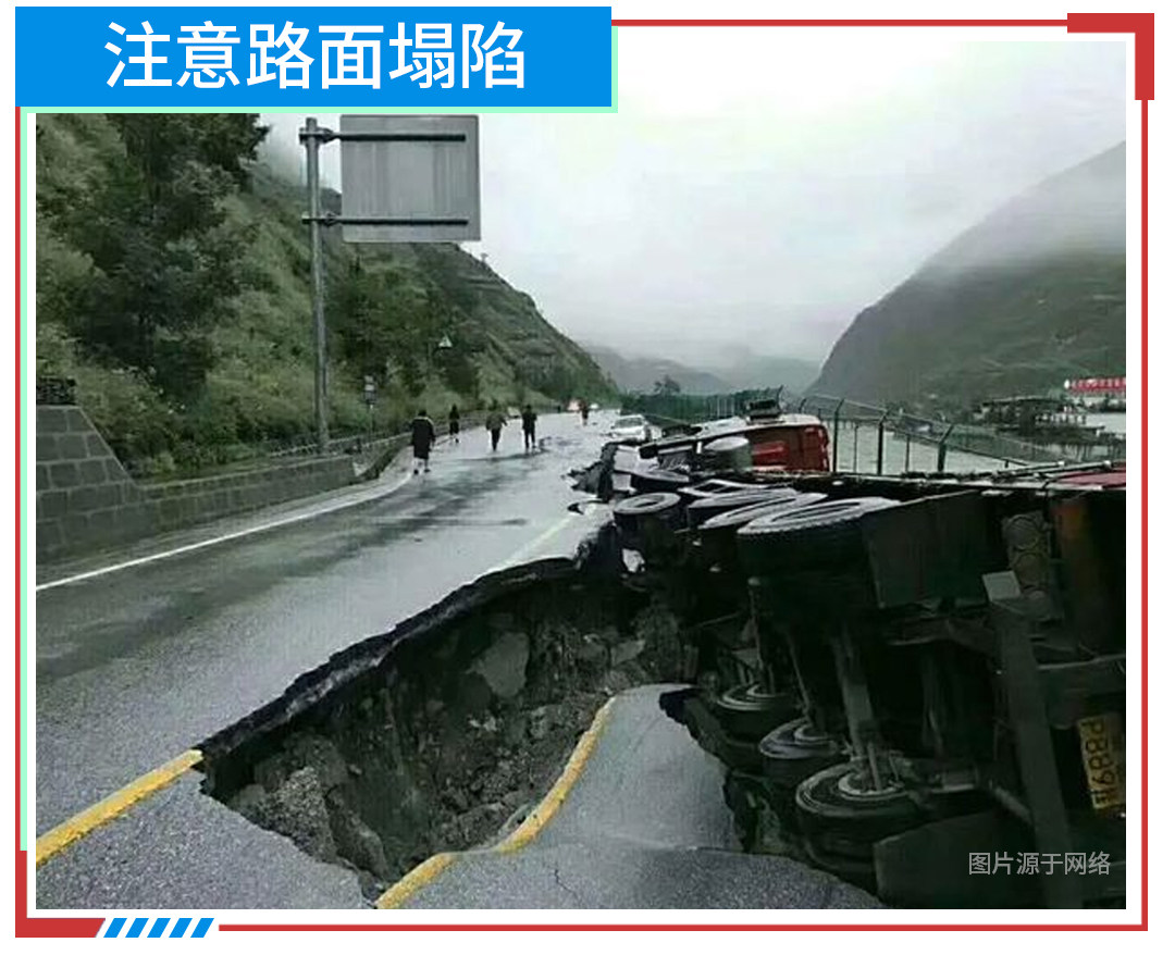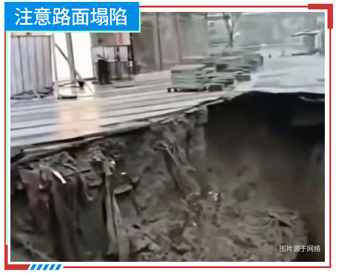 路面塌陷是指路基和路面竖向变形导致路面下沉的现象,这些常见于暴雨时或者暴雨后。驾驶员在通行中一旦发现前方路面有坍陷现象、山体滑坡或遇到坍陷情况,切记安全第一,及时快速撤离至安全区域或选择绕道行驶。尤其要留意路面易塌陷指示牌路段,切不可贸然通行。对于这种易突发且不可预测的情况,更需要在日常驾驶中提高专注,谨慎行驶,以保护自身安全。