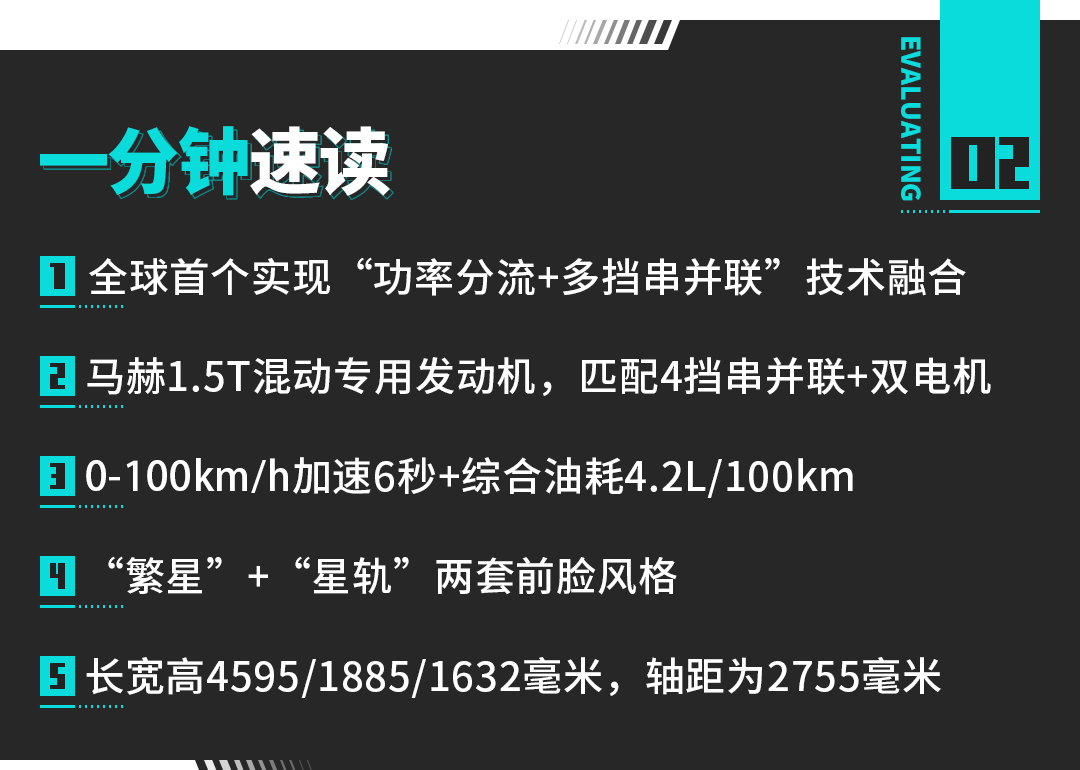 从具体数据来看,皓瀚·马赫电混DH-i是由马赫动力1.5T混动专用发动机+电机组成,变速箱方面则是匹配了4挡DHT,其中发动机的热效率达45.18%,综合最大功率为215千瓦,综合扭矩达565牛·米,因此可以实现不错的零百加速成绩。另外,官方给出的综合平均油耗为4.2L/100km,在同级中优势明显。