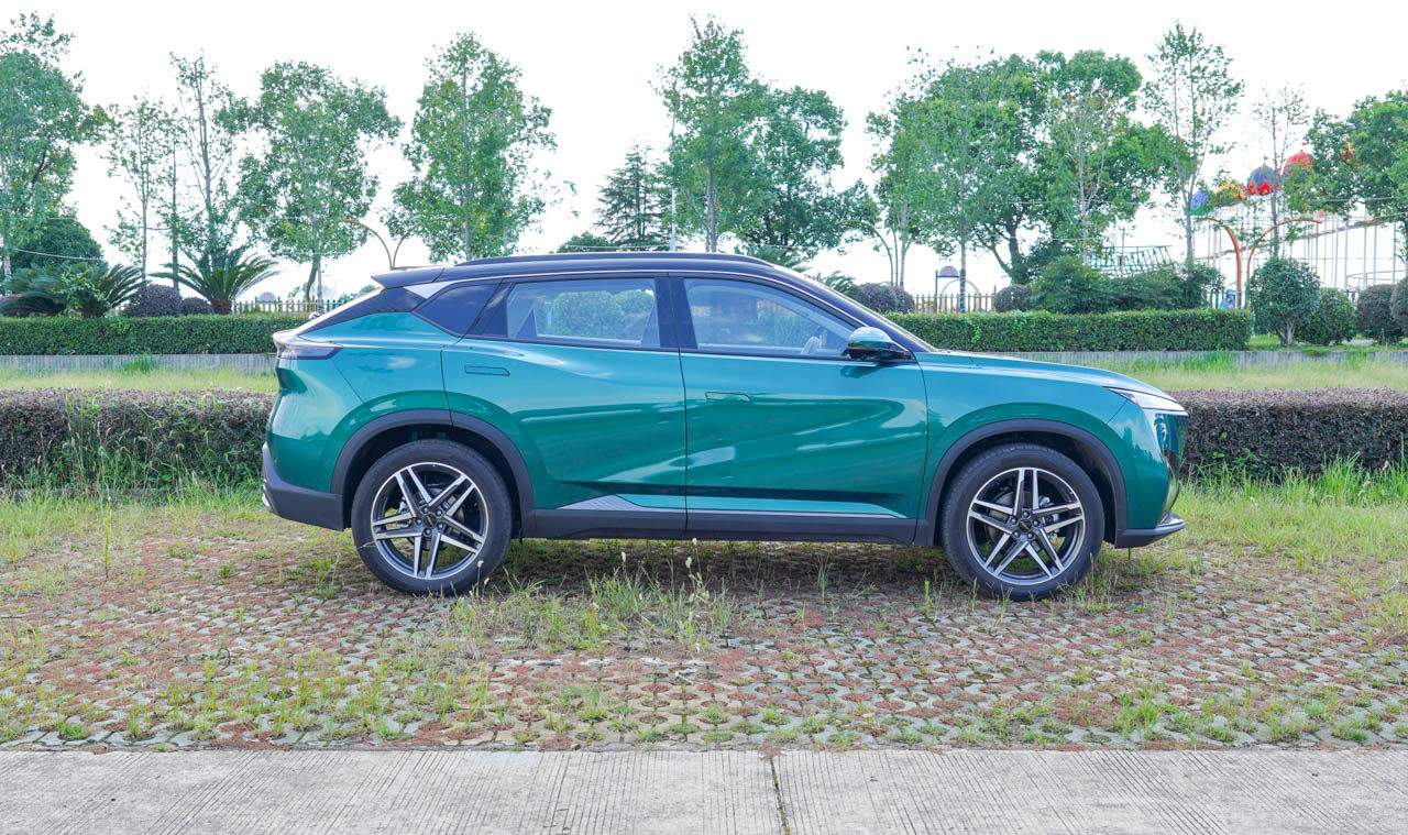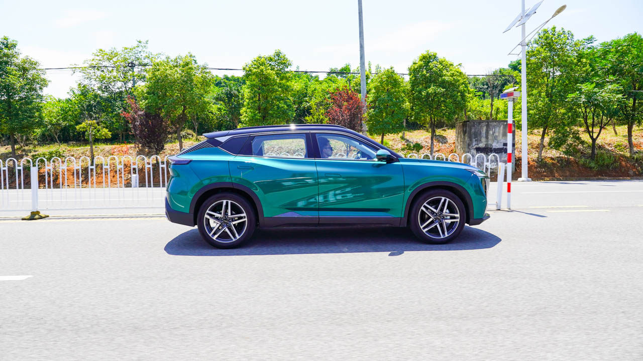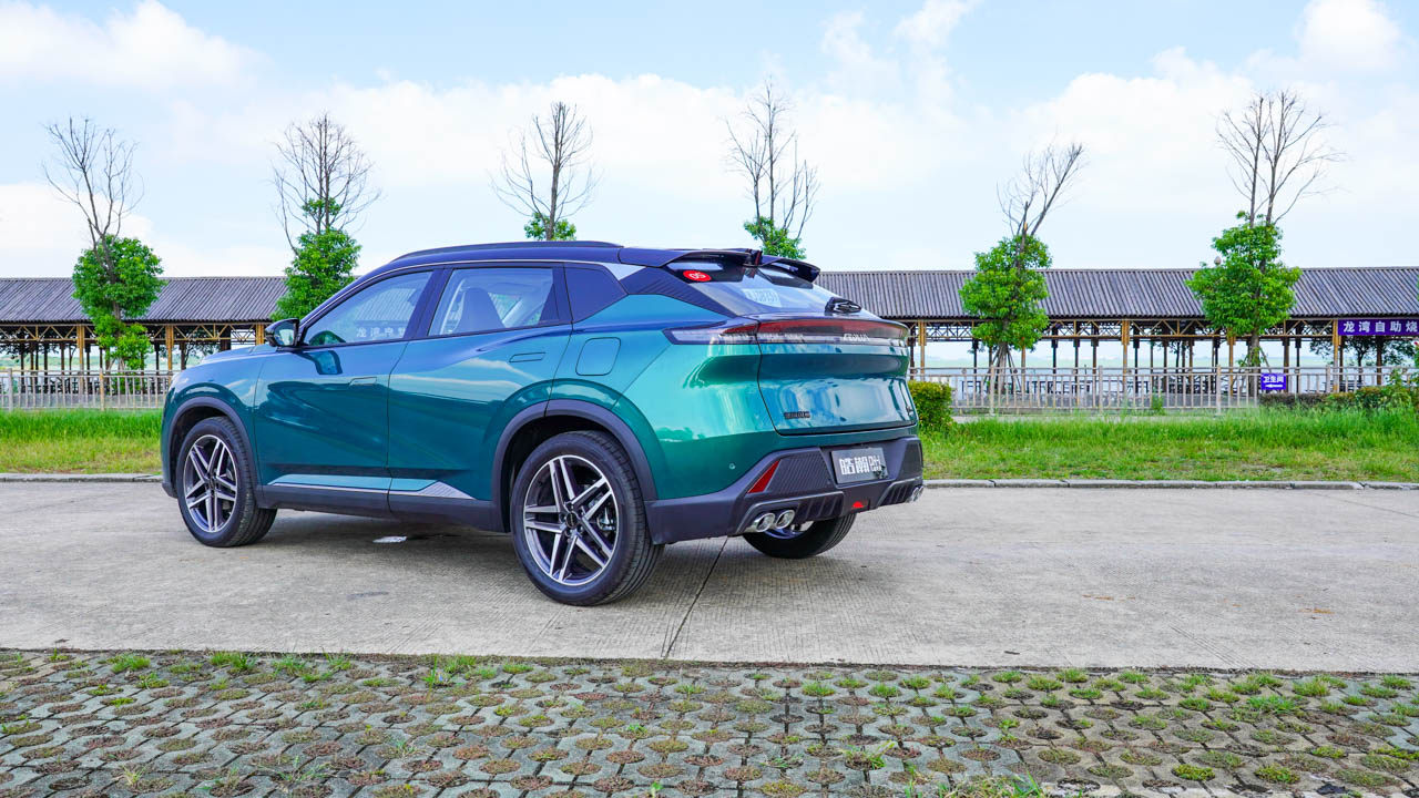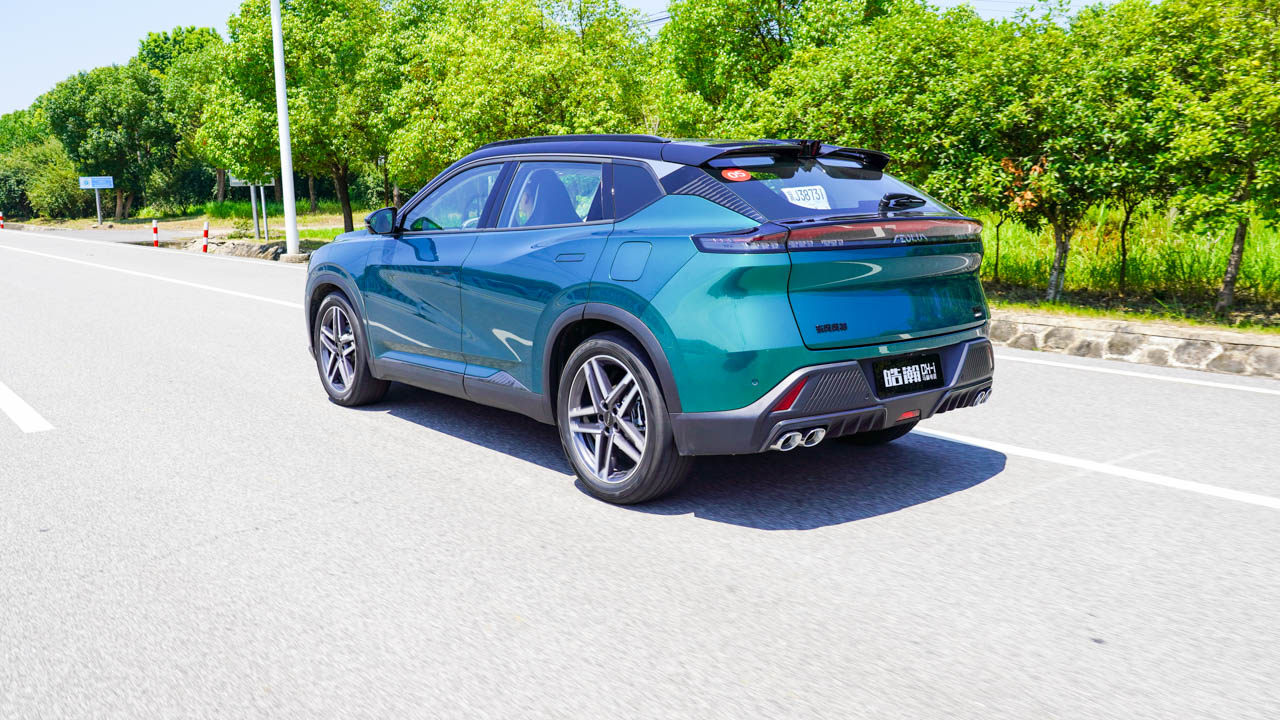 车身侧面,皓瀚·马赫电混DH-i依旧采用简洁干练的新能源风格,平直的线条搭配了隐藏式门把手,新车两侧后腰线加入了富有力量感的弧线,有效提升了新车的运动风味,与D柱半弧式设计完美融合,尽显新车独特个性的设计,但这也源于较为低趴的尾窗造型突显了新车酷似轿跑SUV的感觉。