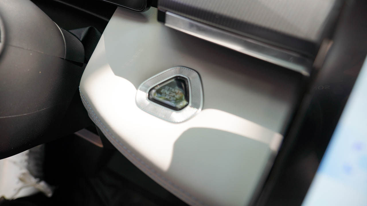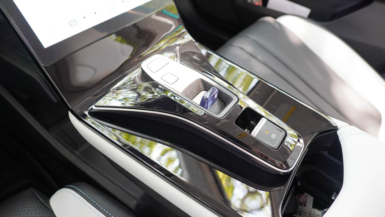 因为车辆采用了纵向布局的中控屏,限制了中控台的多功能布局,但无线充电作为当下必不可少的一个配置,所以被隐藏在中控屏后方,而中控挡把加入了类似水晶的设计,与白色的车内氛围完美融合,有效突显新车高级质感。