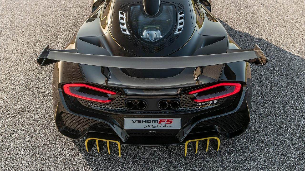 轩尼诗 毒液F5 革命敞篷版的车尾设计极尽夸张复杂。几乎与车顶等高,比车体还宽的巨大尾翼非常惹眼。尾翼下方则是四根中置排气、遍布无数散热孔的后保险杠,以及巨大的黄色空气扩散器。