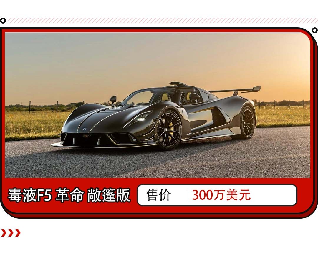轩尼诗 毒液F5 革命敞篷版搭载的V8 6.6L双涡轮增压发动机可以爆发出高达1817匹马力,极速更是高达483km/h。作为参考,一般小型客机速度在500km/h左右。另外,性能强悍的它售价自然也不便宜,你想要拥有它至少需要准备300万美元的购车预算。