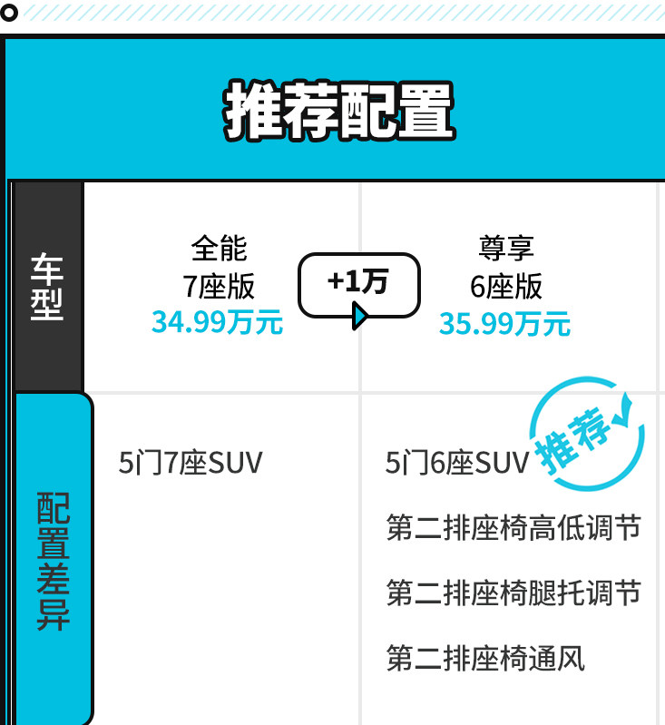 看上图不难看出,两个车型价差1万元,6座版车型第二排采用了航空座椅的设计,且相较于7座版车型多出了第二排座椅高低/腿托调节以及第二排座椅通风,在第二排乘坐舒适性方面可谓是拉满了。所以,购车推荐其实比较清晰明了,如果您对7座需求不大的话,建议选购尊享6座版。而如果您对7座是刚需的话,那毫不犹豫选择全能7座版,虽然第二排座椅舒适度不如尊享6座版,但事实上它的舒适度也已经非常不错的了。